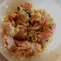 - 4 1のハム、ブラックオリーブ、2、(A)を加えて混ぜ合わせます。