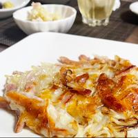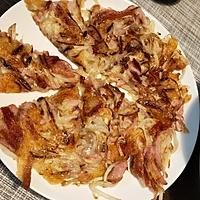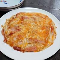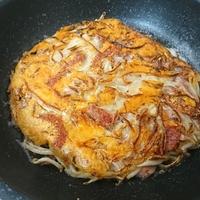 ベーコンを入れました。簡単ですが、レシピ通り、裏表5分ずつ焼きましたが、ベチョベチョになりました。ソースはチリソースがなく、ケチャップにタバスコを入れてみましたが、美味しくなかったです。また、リベンジします。