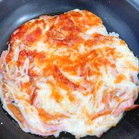 ソーセージはベーコンやハムでも代用できます。 ソースはケチャップのみでもおいしくいただけます。 上から押さえて焼くことで、しっかりと焼き色がつきこんがりと仕上がります。 フライパンは直径26cmのものを使用しています。