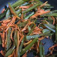 - 4 にんじんがしんなりしたら中火のまま、めんつゆ、白いりごまを入れ、炒め合わせます。