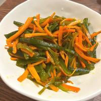 - 3 鍋にごま油を入れ中火で熱し、鷹の爪輪切り、1を入れ、炒めます。にんじんに油が回ったら、2を入れ、3分程炒めます。
