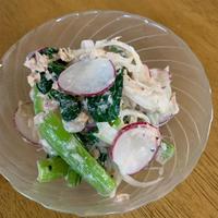 ルッコラ、紫玉ねぎの代わりに水菜を使って、マヨネーズ無かったので無しで。