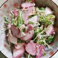 今晩のおかずに、赤カブとツナのサラダはいかがでしょうか。彩りがきれいな赤カブと、旨味たっぷりのツナ、香りのいいルッコラをマヨネーズで和えると、ごはんやパンにぴったりなサラダになりますよ。ぜひお試しくださいね。