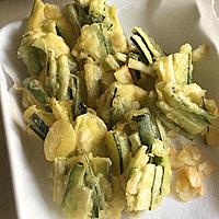 - 3 ボウルに衣の材料を入れて、菜箸でさっくりと粉気が残る程度に混ぜ合わせ、1と2を加えて絡めます。