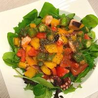 夏野菜とタコを使用した和えるだけの簡単サラダレシピです。ごま油の香りと明太子が夏野菜に合う一品です。お酒のおつまみや食卓にもう一品欲しい時などに最適です。すりおろしたニンニクを加えても美味しく頂けます。お好みでアレンジしてみてください。
