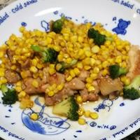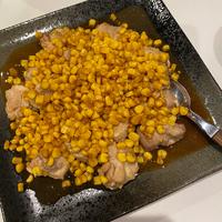 塩麹に漬けてから弱火で焼き。茹でとうもろこしと、醤油酒みりん砂糖と味付け。後から軽く水とき片栗粉で閉じ。