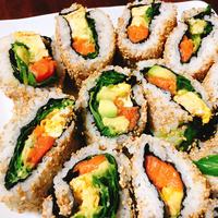 - 3 ラップの上に、白ごま、ごはん、海苔、ベビーリーフ、アボカド、1の卵焼き、スモークサーモンを乗せて、ラップを持って巻いて行きます。