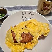 - 5 熱したフライパンにサラダ油をひき、溶き卵を入れ全体に広げます。中火で焼き固まってきたら4をのせ包み、火を止めます。