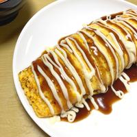 とろーりチーズ入りとんぺい焼き風のご紹介です。たっぷりの長ねぎとチーズを卵で包み、仕上げにソースやマヨネーズをかけて、とんぺい焼き風に仕上げました。簡単に作れるので、お酒のおつまみにもぴったりな一品ですよ。ぜひあつあつをお召し上がりくださいね。