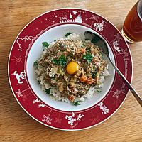 - 6 ごはんをよそった器に5をかけ、卵黄をのせて完成です。