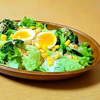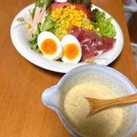 ほんのり酸味があって甘いごまドレが美味しく野菜をたっぷり摂れる。今回はレタス・ゆで玉子・ブロッコリー・コーンを✏️