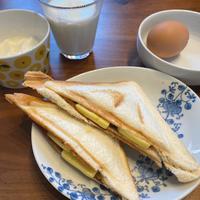 挟むバターは豆乳スライスで代用し、ホットサンドメーカーがないのでフライパンで作りました。塩をふったら甘じょっぱくて美味しかったです。