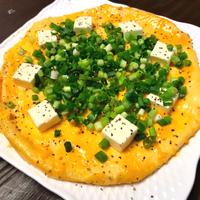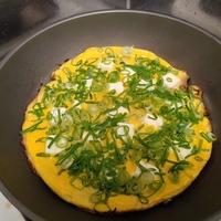 - 2 中火で熱したフライパンにサラダ油をひき、1を流し入れて表面がポツポツして来たら、クリームチーズを散らして小ねぎを乗せます。