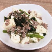 - 6 5に木綿豆腐を加え汁気が少なくなるまで中火で炒めたら、火を止めて、水溶き片栗粉を回し入れて混ぜ合わせます。