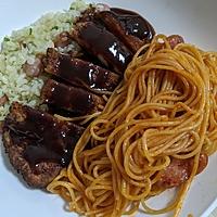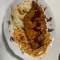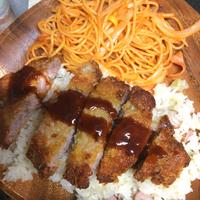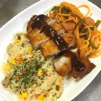 ピラフは炊き込み、ナポリタンは麺を茹でて炒め合わせるまでにしておいて、カツを揚げながらナポリタンを同時進行で忙しかったです😵💦