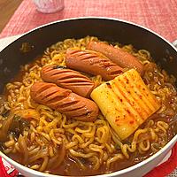 ウインナーの旨辛ラッポッキ風はいかがですか。旨味のあるウインナーと玉ねぎの甘味、モチモチ食感のトッポギとインスタントラーメンに、コチュジャンが効いた甘辛ダレが絡んでおいしいですよ。ぜひお試しください。