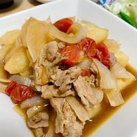 肉じゃがにトマトを加えて、さっぱりとしたトマトの酸味が美味しい味に仕上げました。豚バラ肉の下ごしらえをしたら、フライパンに材料や調味料を全部入れて煮るだけの簡単レシピです。主菜にも副菜にもどうぞ。ぜひお試しください。