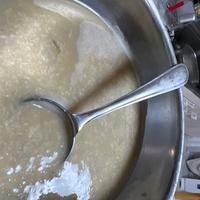 めんつゆの代わりに白だし使用、少量の溶き卵も加え、すりこ木でひたすら攪拌しています。