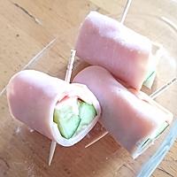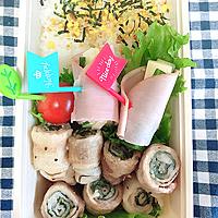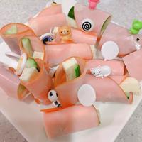 - 3 ハムの中央に1と2を交互に並べて巻きます。2ヶ所をピックで留めます。