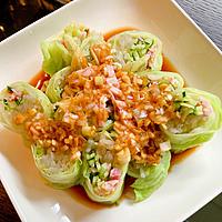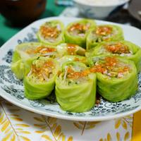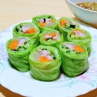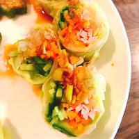 キャベツの葉が小さかったので細切れのものを何枚も敷き詰めて巻いたのですが、それなりに形になりました。しょうがを抜いてスイートチリソースをかけると生春巻きみたいでいいかも!