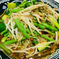 ニンニクの芽、さやいんげん、きゅうり、かいわれ大根、たっぷりのグリーン野菜と万能野菜もやしを使った炒め物です。味付けは焼肉のタレのみ!焼肉のタレには美味しさがたっぷり詰まっているのでこれだけで充分。ごはんがすすむ一品です。