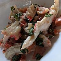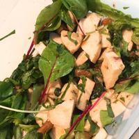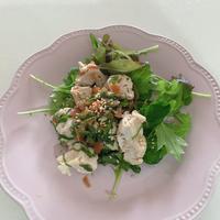 - 5 ベビーリーフをお皿に盛り、4を乗せ、白いりごまをトッピングして完成です。