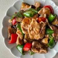 【1人分】茄子1・ピーマン4・薄切り豚ロース100・調味料半量(豆板醤少なめ)。野菜を先に炒めて取り出し、お肉を炒めて野菜と調味料を合わせた✏️