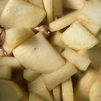 - 3 色が変わってきたら大根、水、和風出汁の素を入れ一煮立ちさせます。