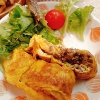 中の具は牛豚合い挽き肉60〜70g、玉ねぎ1/4個で作り、卵は4個にコンソメ顆粒大さじ1/2弱、塩胡椒少々、マヨネーズ少々を加えて焼きました。