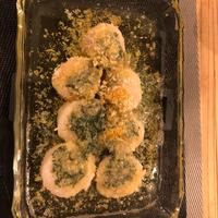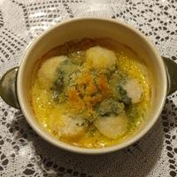 - 2 耐熱皿に、ホタテを並べ、1を乗せてパン粉を振りかけます。