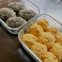 あんこ、胡麻、きなこの3種、胡麻ときなこの中にも餡を少し入れ、まぶすときは小さめのタッパーに入れてフリフリするとまんべんなくつけることができました。どれも美味しかった。