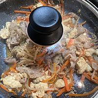 - 4 しんなりしてきたら豚こま肉を加えてさらに炒めます。
