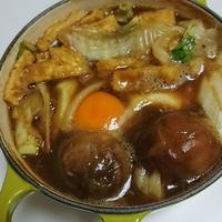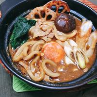 カレー鍋焼きうどんのご紹介です。鍋焼きうどんにカレールーを入れてお手軽にアレンジしてみました。普段の鍋焼きうどんとひと味違ったおいしさですよ。アツアツのカレーうどんに半熟の卵を絡めてお召し上がりくださいね。