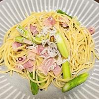 旬のアスパラが食べたくて、作りました。しらすはたっぷり55g使用。塩と黒胡椒は、クレイジーソルトで塩分控えめにしました。とても美味しく出来ました。また、作ります。