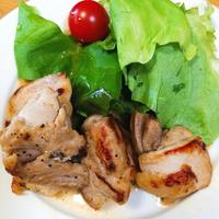 - 5 鶏もも肉に火が通ったら火から下ろします。レタスを敷いた器に盛り付け、レモンを添えて完成です。