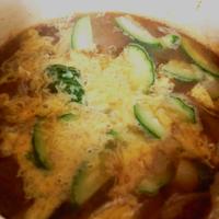 溶き卵を加える際は、卵に火を通すために沸騰してから入れてください。 きゅうりは予熱で火が通るので、火にかけずに仕上げています。