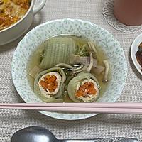 - 5 鍋に4の巻き終わりを下にして入れ、水とコンソメ顆粒を入れて中火にかけ、ひと煮立ちさせます。
