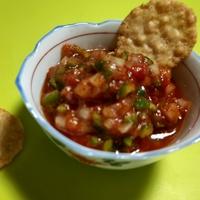 先日作ったスパイスチキンカレーで余ったトマト缶を使いました。トマト缶って大体200g使うようになっているので必ず余るんですよね(笑) パクチー嫌いなのでパクチーはなしで。タコスもチップスもなかったのでひとくち薄焼で(笑)これはパーティーなんかによろしいかと。