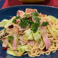 パスタにせず、おかずにしました。キャベツを半玉近く使ったので、全体的に味付けを濃いめにし、コンソメとパセリ、最後に卵2つを加えて仕上げました。ピリッとしてペペロンチーノ風で美味しいです。何より安い!