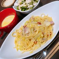 - 5 次に、キャベツ、薄切りハーフベーコンを入れ中火で炒め、パスタの茹で汁、醤油を入れ炒め合わせます。
