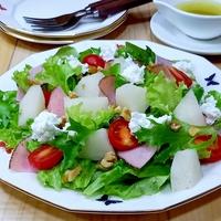 梨とクリームチーズのサラダはいかがですか。シャキシャキとした食感の梨の甘味、塩気のあるクリーミーなクリームチーズとみずみずしい野菜が、レモンの効いたドレッシングとよく合いおいしいですよ。ぜひお試しください。