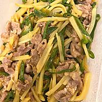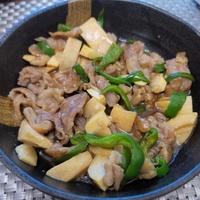 - 5 肉に片栗粉をまぶして炒め、色がついたらピーマンとたけのこを炒めます