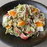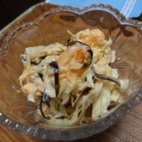 - 2 ボウルにキャベツ、塩昆布を入れて混ぜ合わせ、5分ほどおきます。キャベツがしんなりしたら1、マヨネーズを加えて混ぜ合わせます。