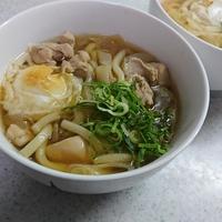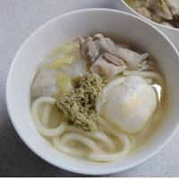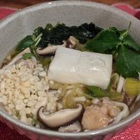 鶏肉のダシがたっぷり染み出た優しい味わいが特徴の具沢山うどんです。具材は鶏肉を中心に、人参、小松菜、お餅など、お好みの食材をアレンジして楽しめます。うどんだけでなく、そばに変えても美味しく、油揚げや椎茸を加えるとコクと旨みが更にアップします。ネギをたっぷり入れたり、最後に七味をかけたりとアレンジ自在。家族みんなが満足できるボリューム満点の一品です。