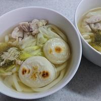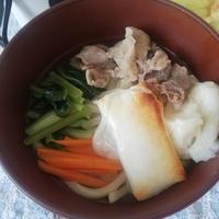 余っていた餅は別のレシピで使ってしまったので、餅、三つ葉、しいたけ無しでしたが、代わりに油揚げをのせました❣️前回は、そばで作って、今回はうどんで作りました🌟どちらも美味しかったー😆💟💟