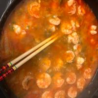 長ねぎ少なめ玉葱多め・えび適量・豆板醤ちょろっと、他そのまま。酸味が効いたカレーでえびもぷりっと美味しい。パクチーは苦手だからなし、ジャワカレー使用✏️