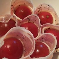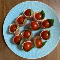 バジル忘れました!生ハムとチーズをプチトマトへくるくると巻くだけで簡単にできました🍅