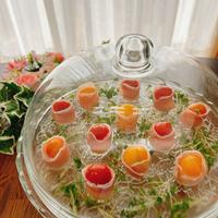 カラフルなミニトマトの甘酸っぱさと生ハムの塩気、チーズのコクが見事に調和した一品です。コロンと可愛らしい見た目は、まるでお花畑のよう。最後にオリーブオイルをかけると、ワインやお酒のおつまみとして更に美味しさがアップします。バジルの香りが爽やかなアクセントに。巻くのは少し難しいですが、ミニミニサイズのトマトなら扱いやすく、パーティーメニューとしても素敵です。