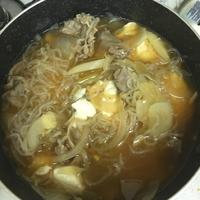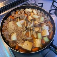 材料▷玉ねぎ1個、しらたきひと袋、長ネギ20センチ、豚しゃぶ肉200、豆腐一丁