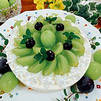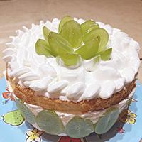 - 10 型を外した8上部を覆うように9をのせて塗り広げ、丸くクリームを絞ってデコレーションし、残りの白ぶどうを飾りできあがりです。